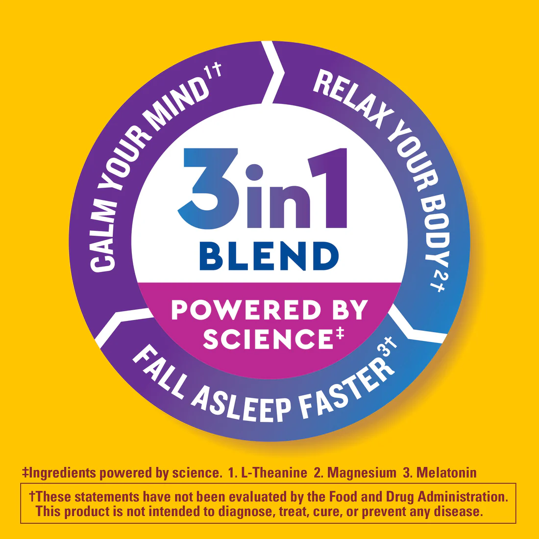 Get a 3-in-1 blend powered by science.‡ Nature Made® Wellblends™ Sleep & Recover™ Gummies offer 3 benefits in 1 blend to provide relaxing sleep support. This 100% drug free sleep aid combines 3 mg Melatonin with 100 mg Magnesium and 200 mg L-theanine in two tasty gummies to support restful sleep to help your body’s natural recovery. Melatonin helps you fall asleep faster so you can wake up refreshed. L-theanine helps you unwind by relaxing your mind, and Magnesium helps relax the body. All that support in just two delicious Dreamy Berry sleep gummies with no artificial flavors. Give your body the relaxing sleep support it needs, with Nature Made® Wellblends™ Sleep & Recover™ Gummies.†